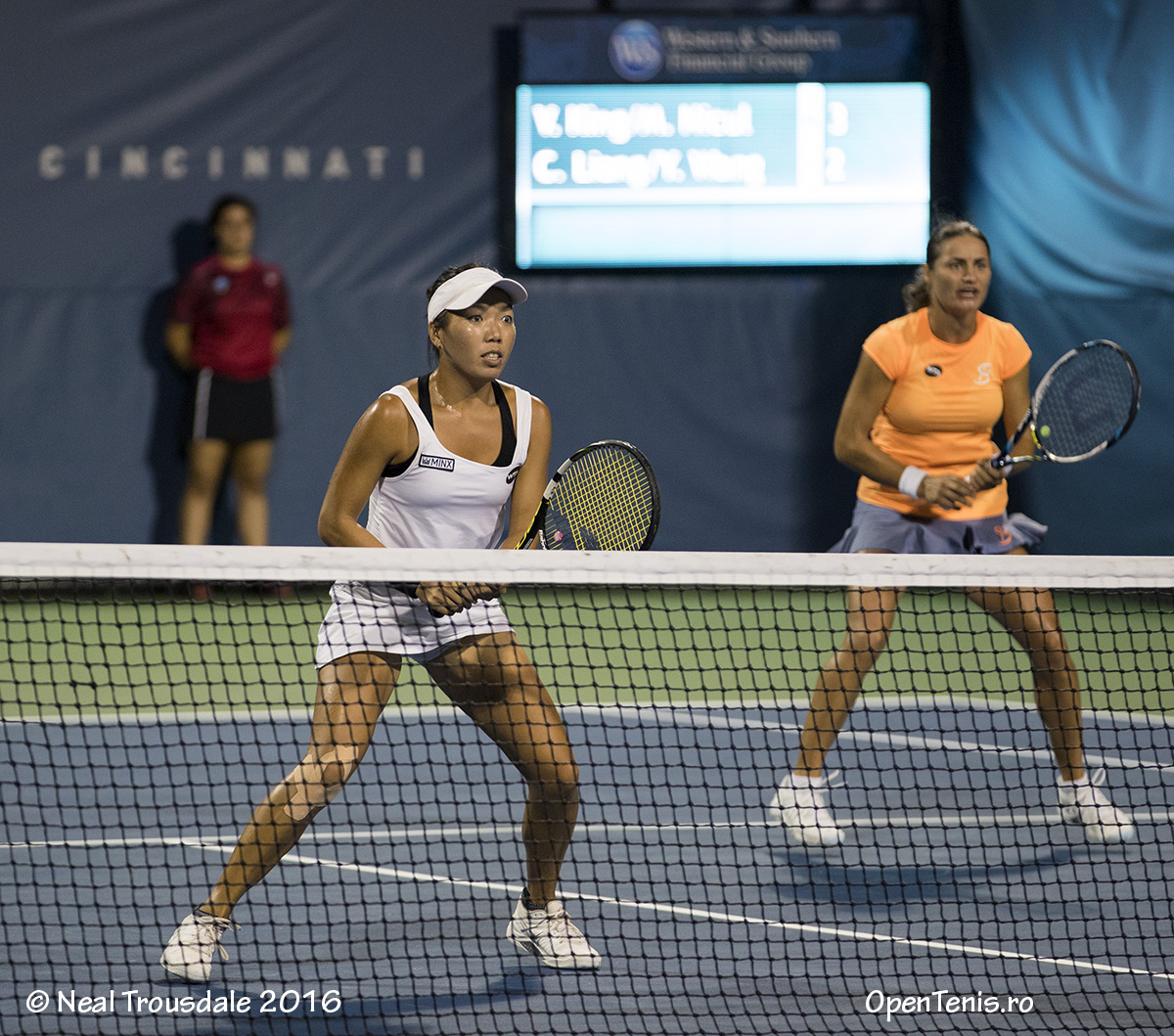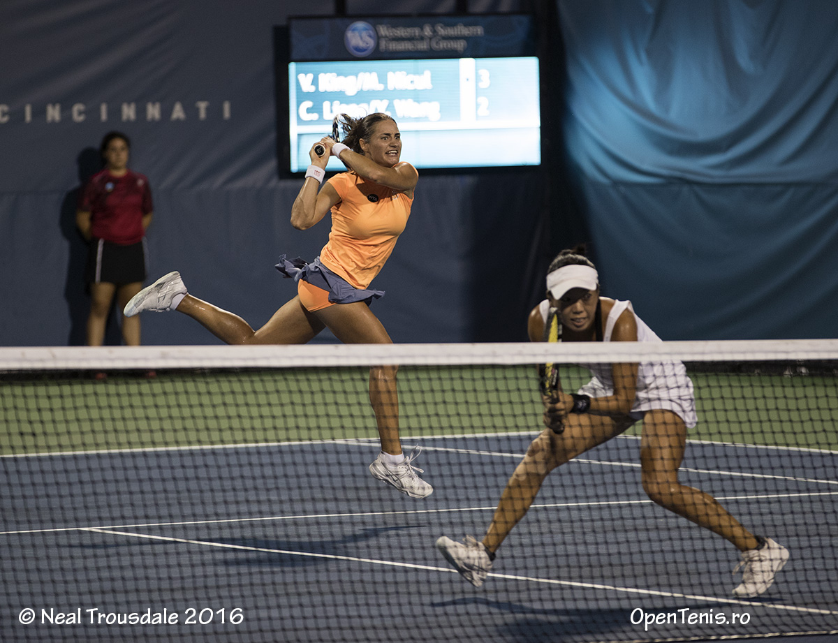 Perechea alcătuită din Monica Niculescu şi americanca Vania King s-a calificat în optimile probei de dublu din cadrul turneului WTA de la Cincinnati (Ohio), dotat cu premii totale de 2.503.250 dolari. Ele au dispus cu 7-6 (4), 6-3 de cuplul chinez Chen Liang, Yafan Wang. Cele două le vor înfrunta în turul al doilea pe franţuzoaicele Carolina Garcia, Kristina Mladenovic, principalele favorite şi câştigătoarele de la Roland Garros. Niculescu şi King au mai jucat împreună o dată anul acesta, la începutul anului, la Shenzhen, unde au câştigat titlul. Tot la dublu, în primul tur, perechea româno-cehă Raluca Olaru, Renata Voracova va întâlni cuplul Sara Errani (Italia), Carla Suarez-Navarro (Spania). Irina Begu o va înfrunta, în primul tur la simplu, pe suedeza Johanna Larrson (lucky loser). Simona Halep este a treia favorită a turneului şi va juca direct în turul secund, cu învingătoarea meciului Annika Beck (Germania, 44 WTA) - Yulia Putintseva (Kazahstan, 43 WTA). În acest moment, scorul este 6-2, 2-3.